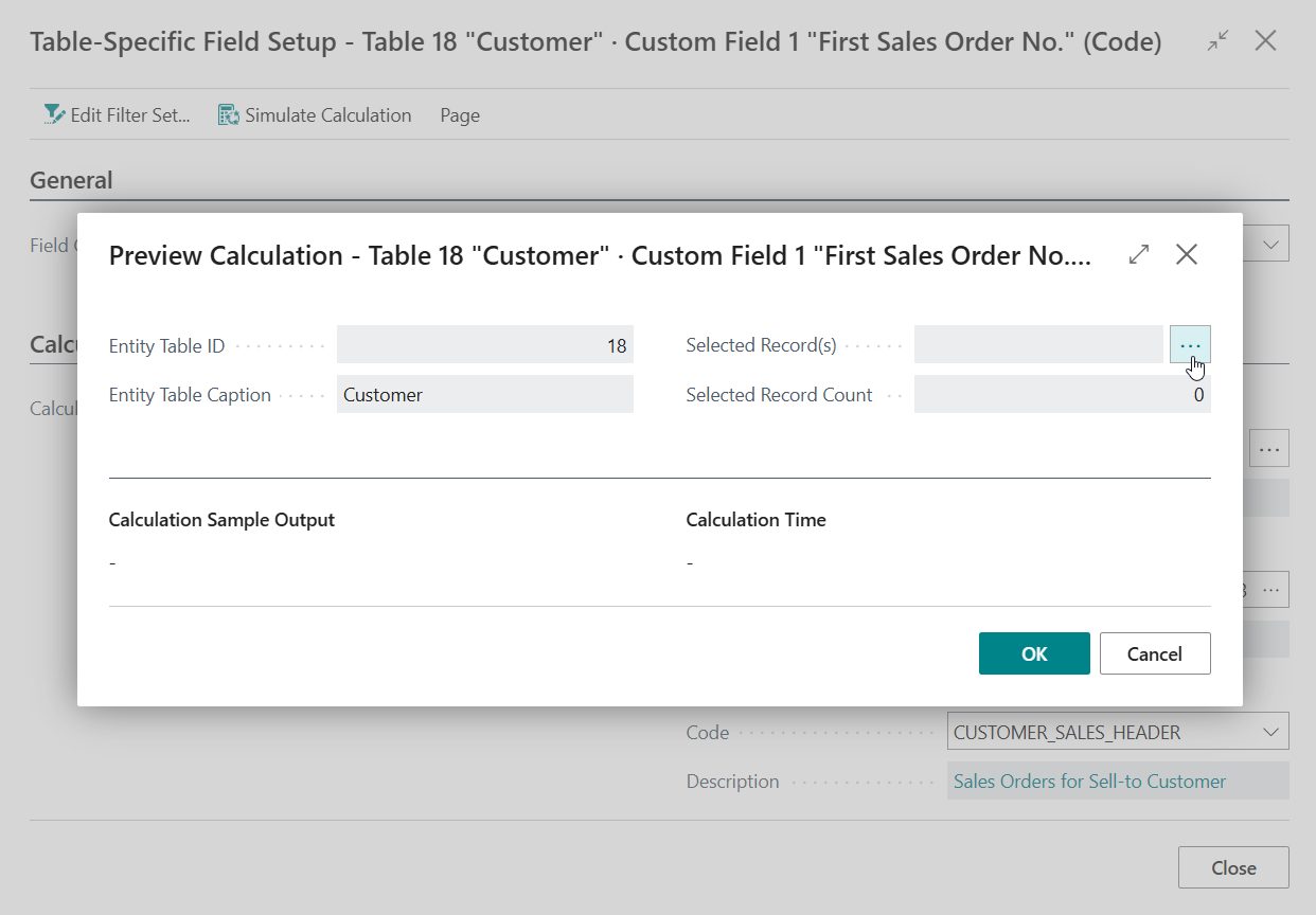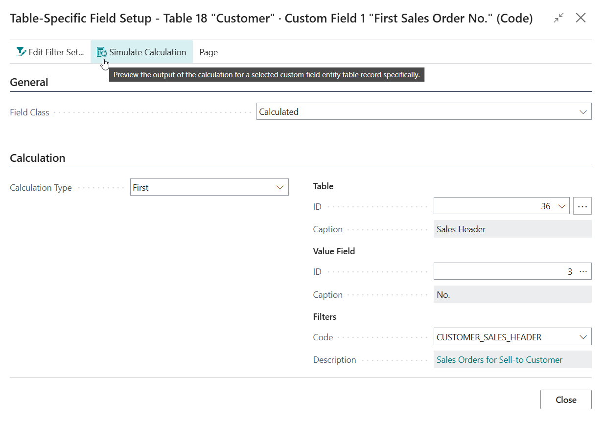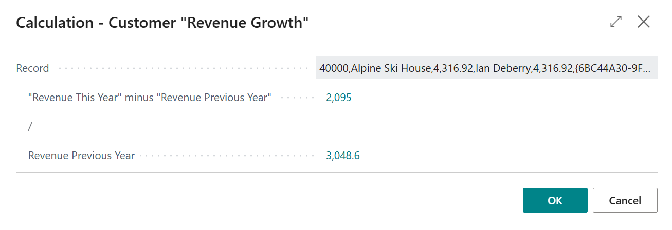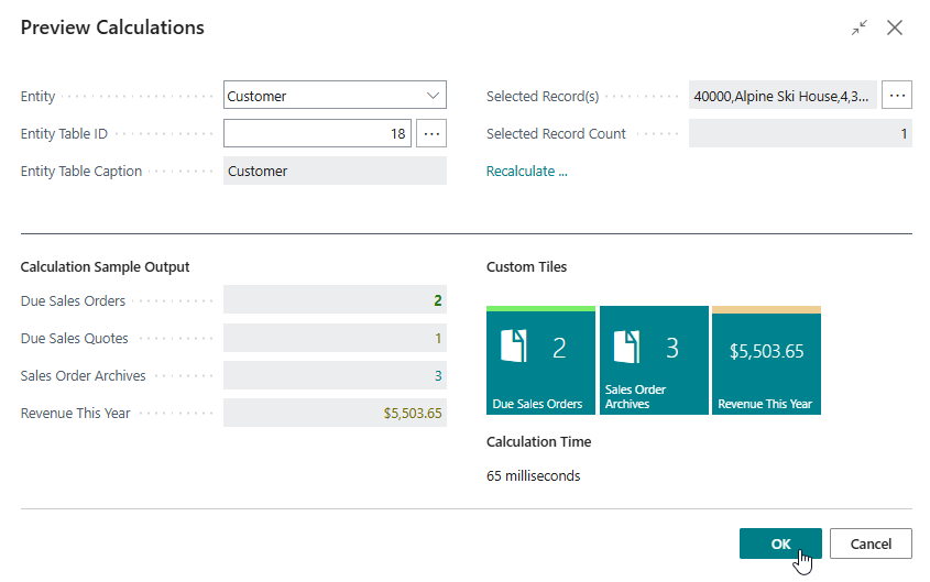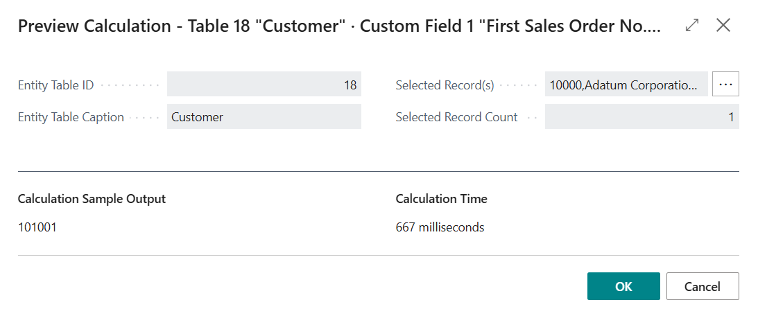 Additionally, below the Calculation Time label you will find a measurement of the time it took to calculate the output. Please note that the calculation time is dependent on multiple factors but is important to keep in mind as you should avoid that your calculated fields decrease performance of Business Central and lead to users waiting a long time for pages to load.