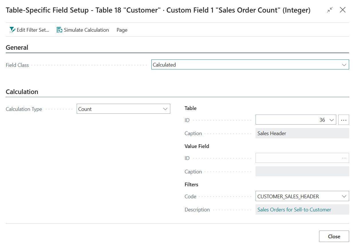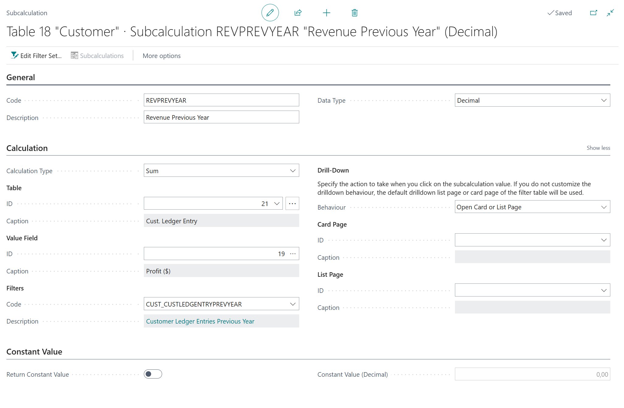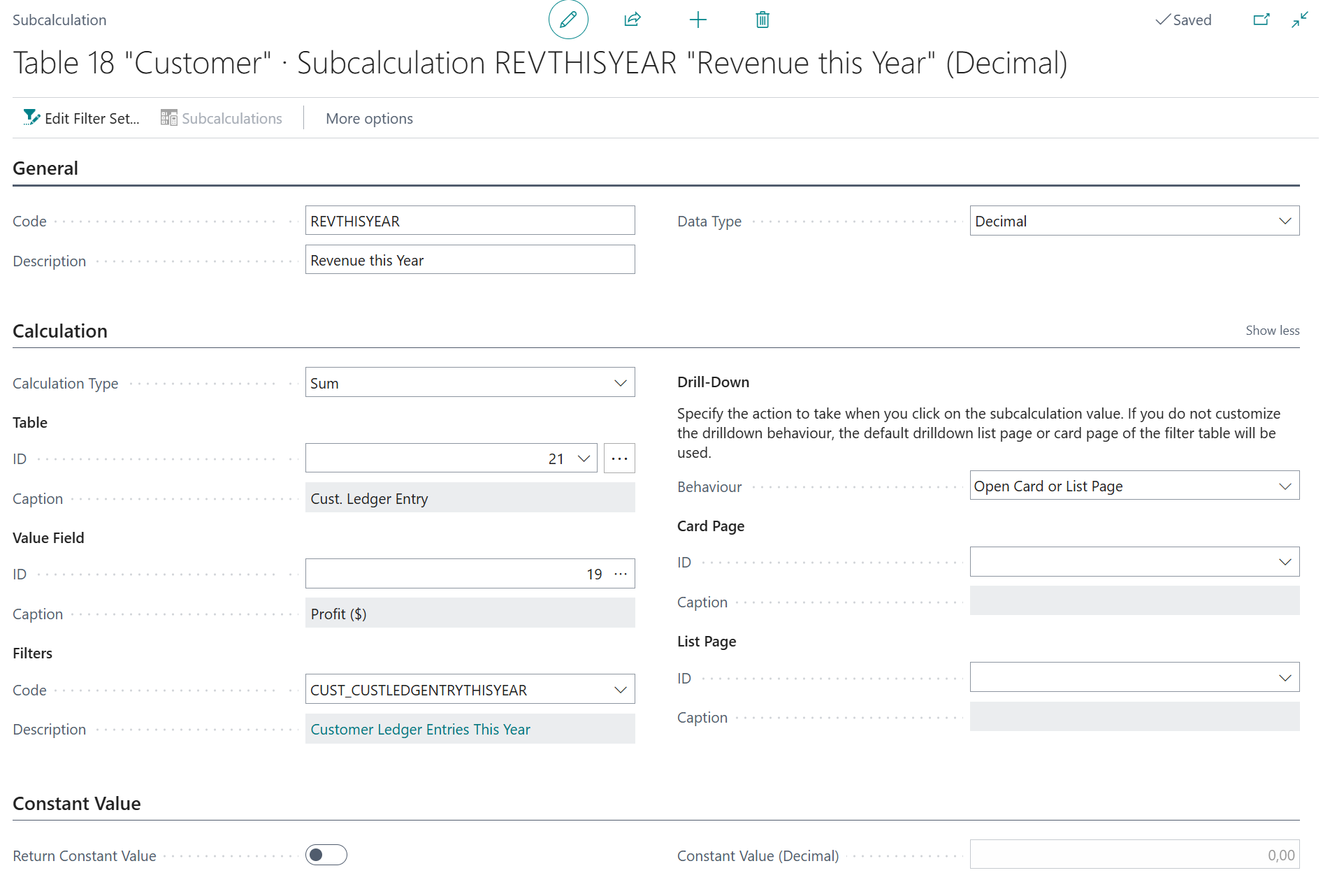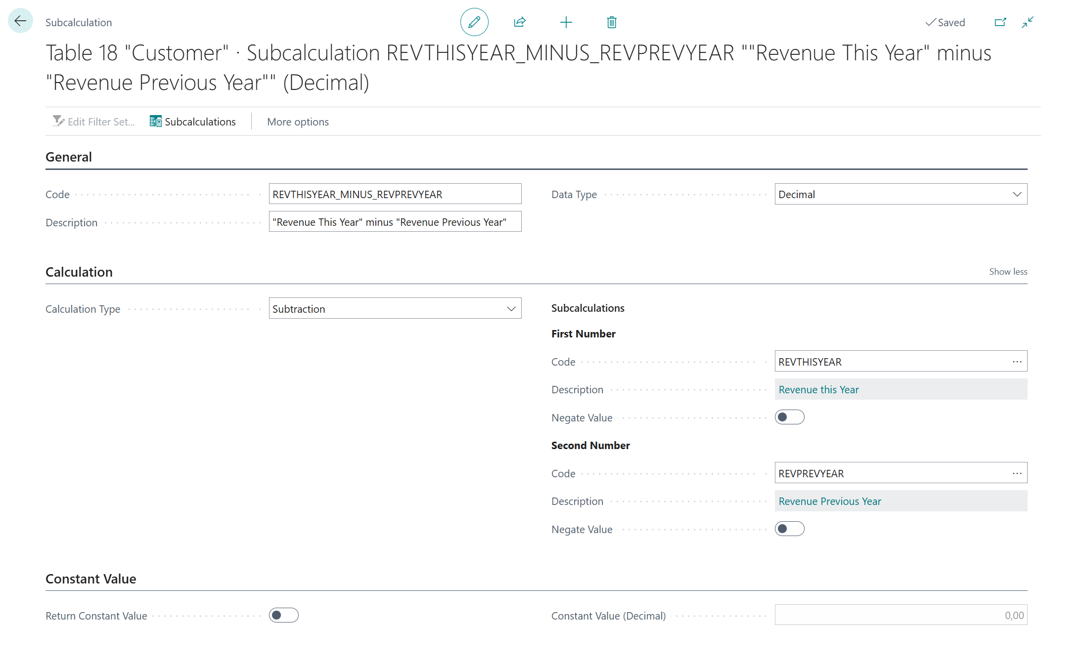 Additionally, below the Calculation Time label you will find a measurement of the time it took to calculate the output. Please note that the calculation time is dependent on multiple factors but is important to keep in mind as you should avoid that your calculated fields decrease performance of Business Central and lead to users waiting a long time for pages to load.