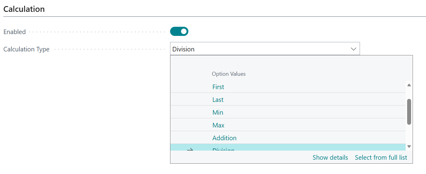 For composite calculation types the calculation is performed via so-called Subcalculations, which perform calculations that are combined to calculate the end-result (e.g., a division or multiplication).