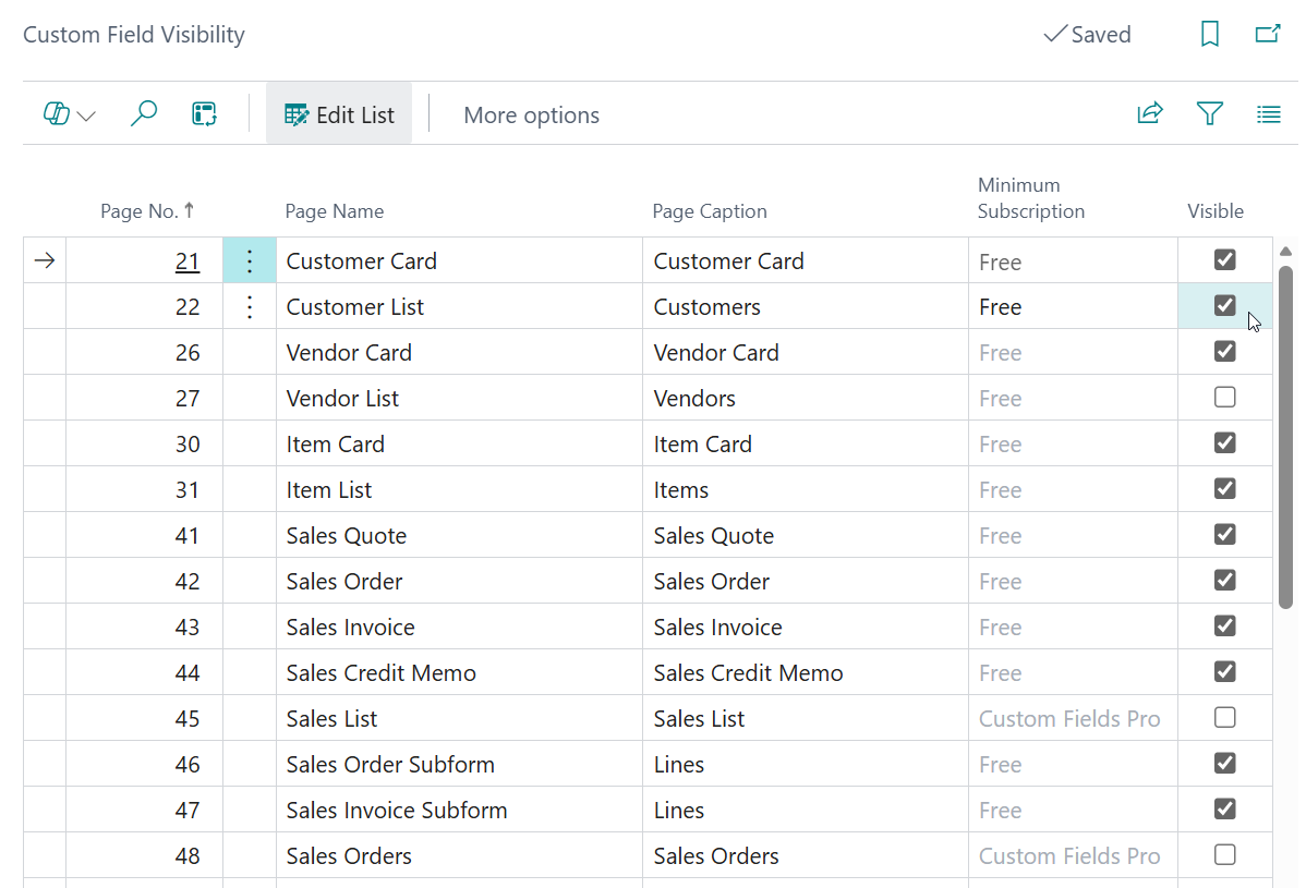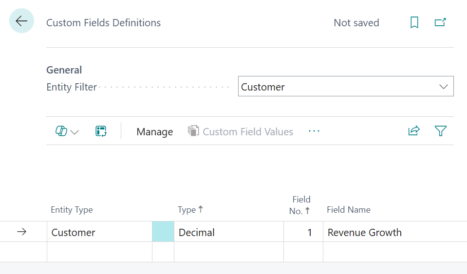 | Page Field and Tile | The custom field is shown in the Custom Tiles factbox on the card and/or list page as a tile and on the card page as a field. Only supported for Decimal and Integer fields. |