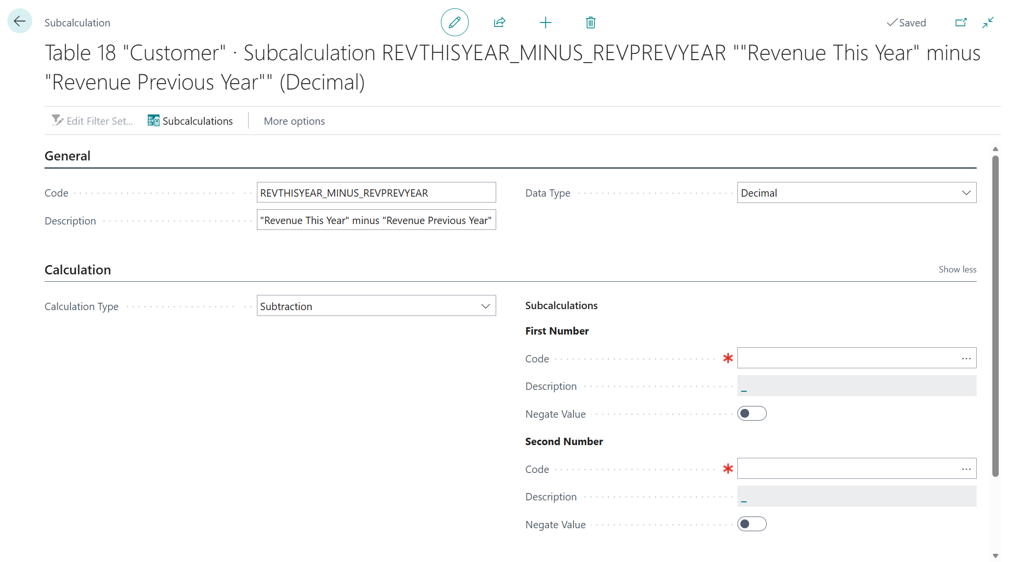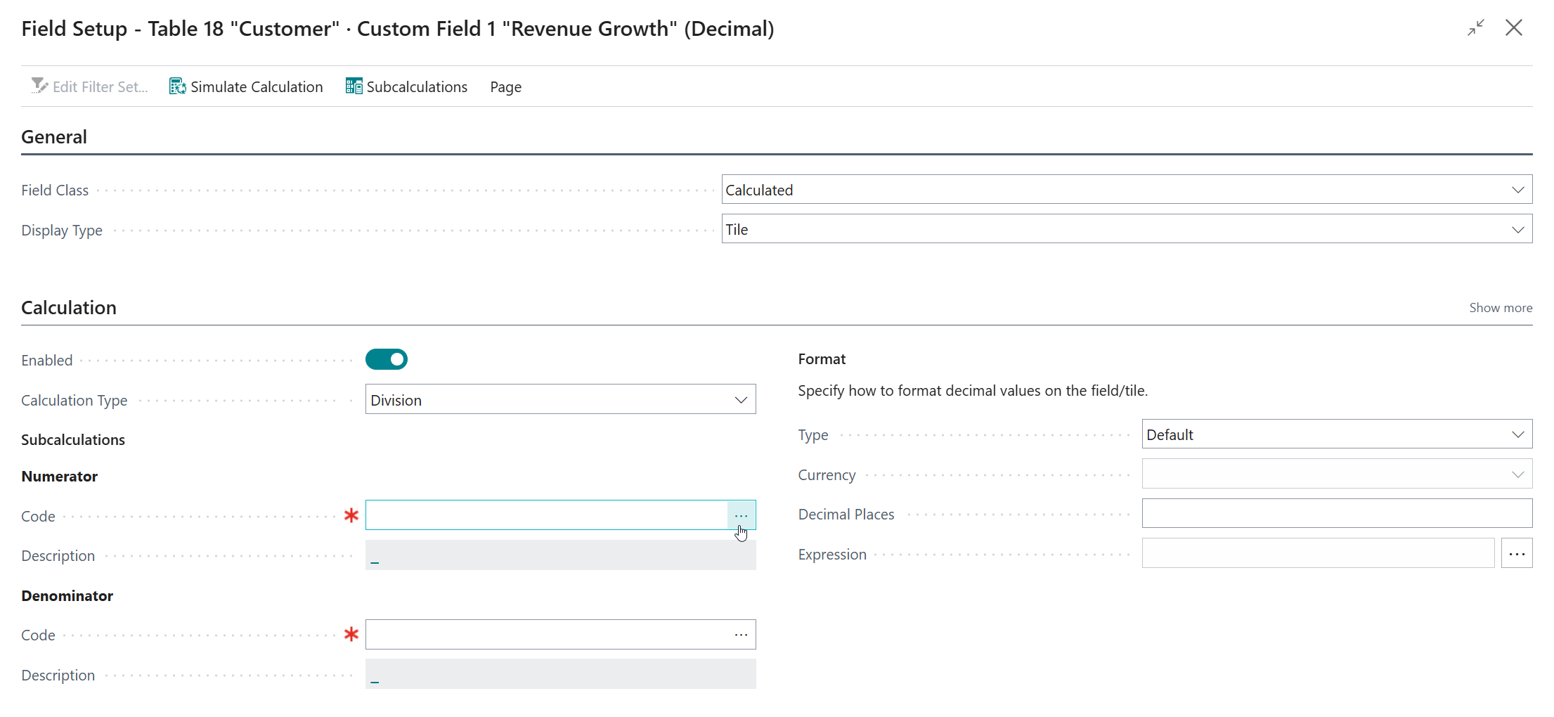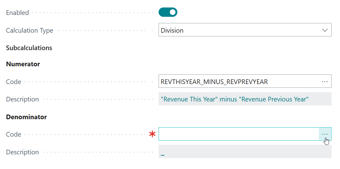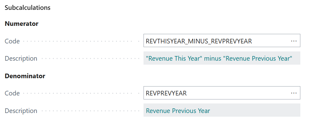\[ \text{“Revenue This Year”} - \text{“Revenue Previous Year”} \]On the Numerator - Code page field, click on the Assist-Edit () button to set up the subcalculation to use.