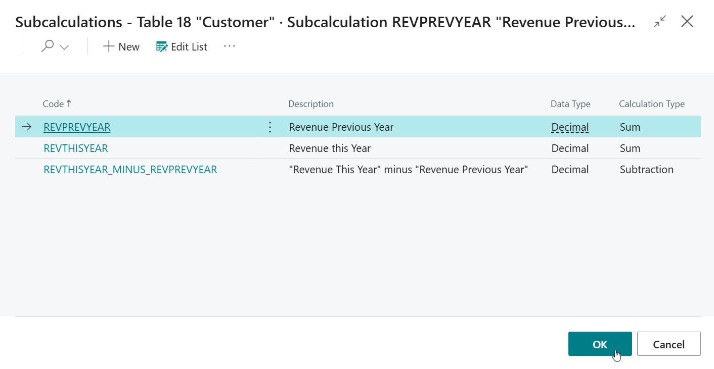 REVPREVYEAR(Revenue Previous Year) subcalculation, and then click on OK.