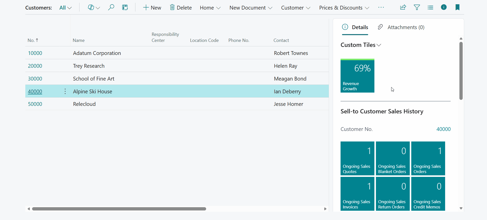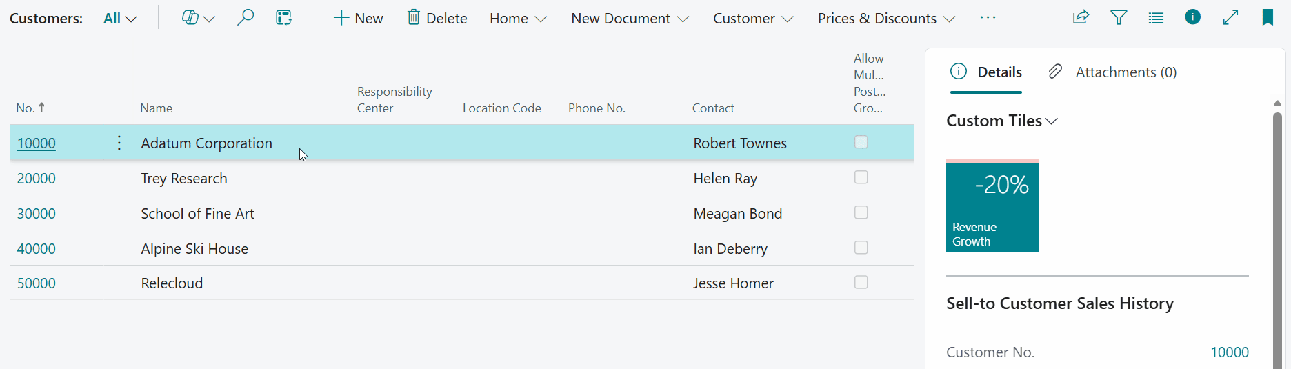 9300"(Sales Quotes"). - Now the Customers list page and the Customer Card page have a new tile called Due Sales Quotes visible in the Custom Tiles factbox.