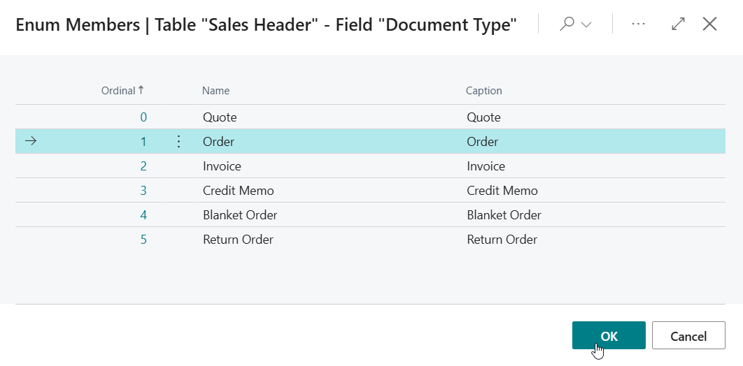 Enum/Option fields are based on enum filtering, when you fill in for example Order in the Document Type field in table Sales Line the system automatically recognizes that this is option 1 which is the ordinal/numeric value for Order.