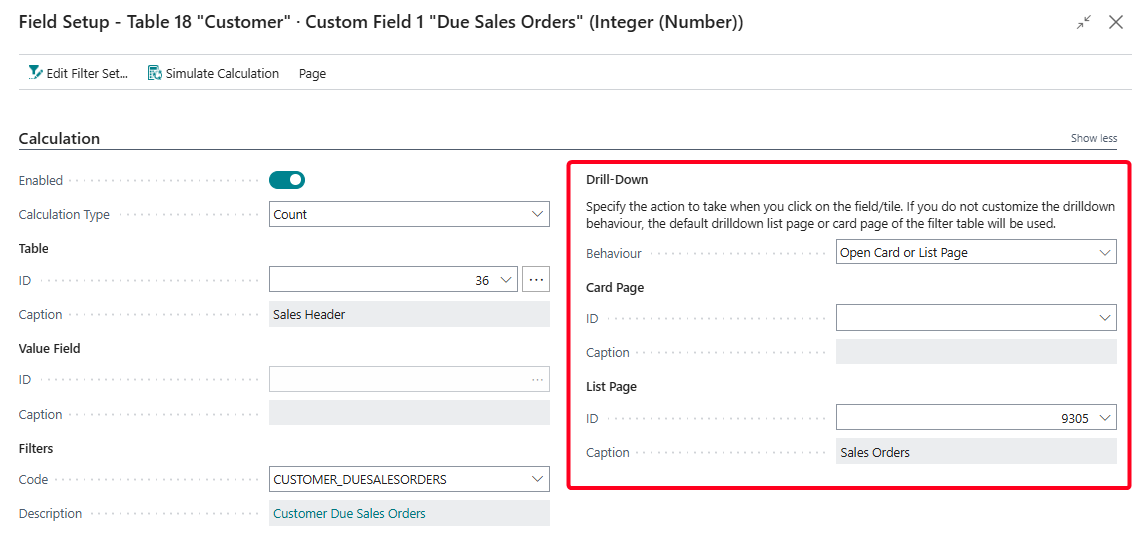 - Under Drill-Down you must specify the right Behaviour, in this case we always want to open the "Sales Quote List" page, so the Behaviour in this case must be Open List Page, as the List Page you can select ID =