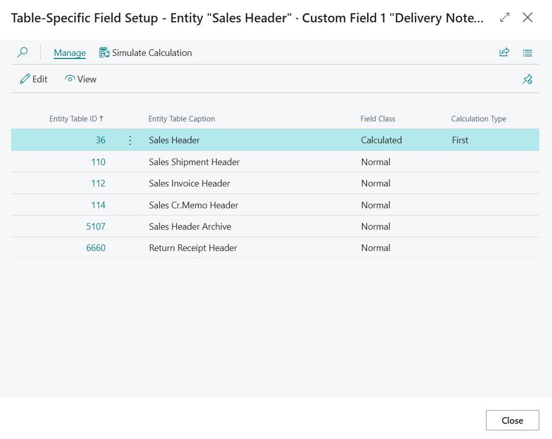 This opens the Table-Specific Field Setup where one can configure table-specific preferences for a custom field. The Customer entity only has a single table where custom fields are added (i.e., table "Customer"), whereas the Sales Header entity has multiple tables where custom fields are added (i.e., "Sales Header", "Sales Invoice Header", "Sales Shipment Header", "").