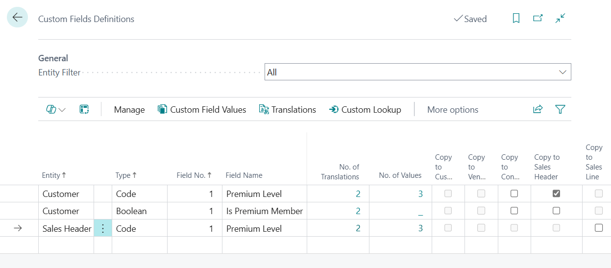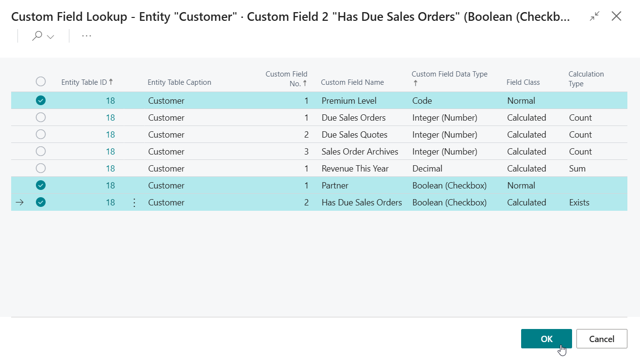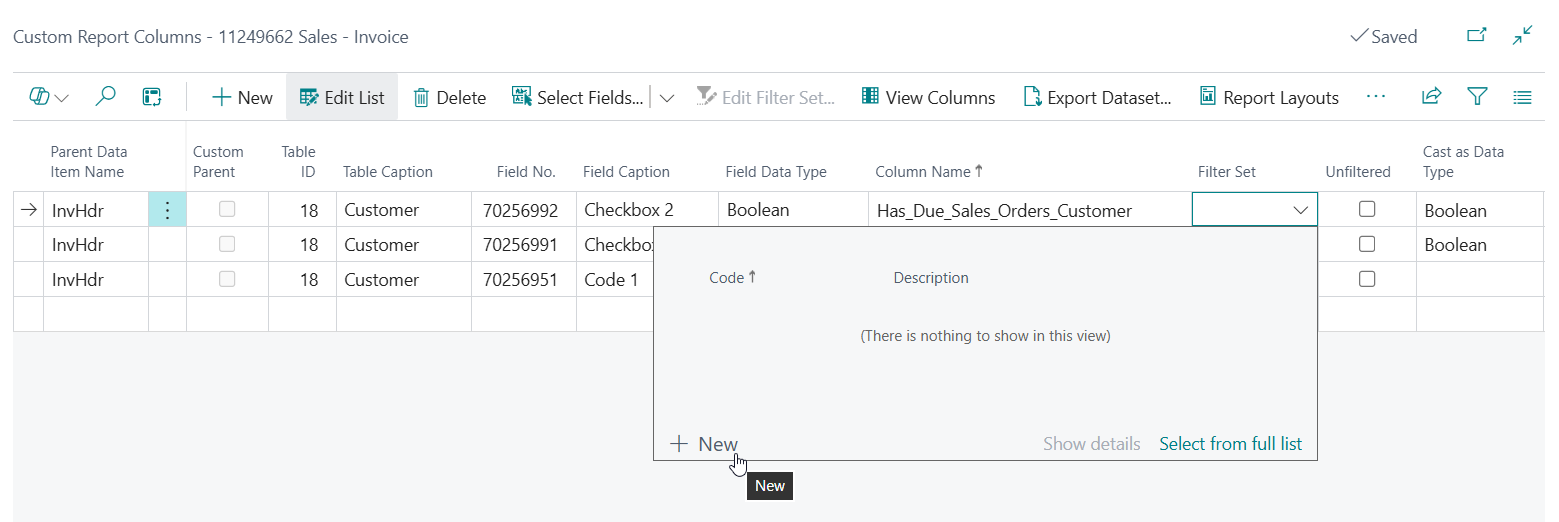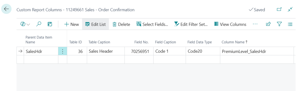 Please note that the Custom Fields have a dynamic caption, which is displayed when you view the fields on pages in Business Central. However, when you need to use the fields as columns in reports and their corresponding layouts, then you will need to determine the table field name to use.