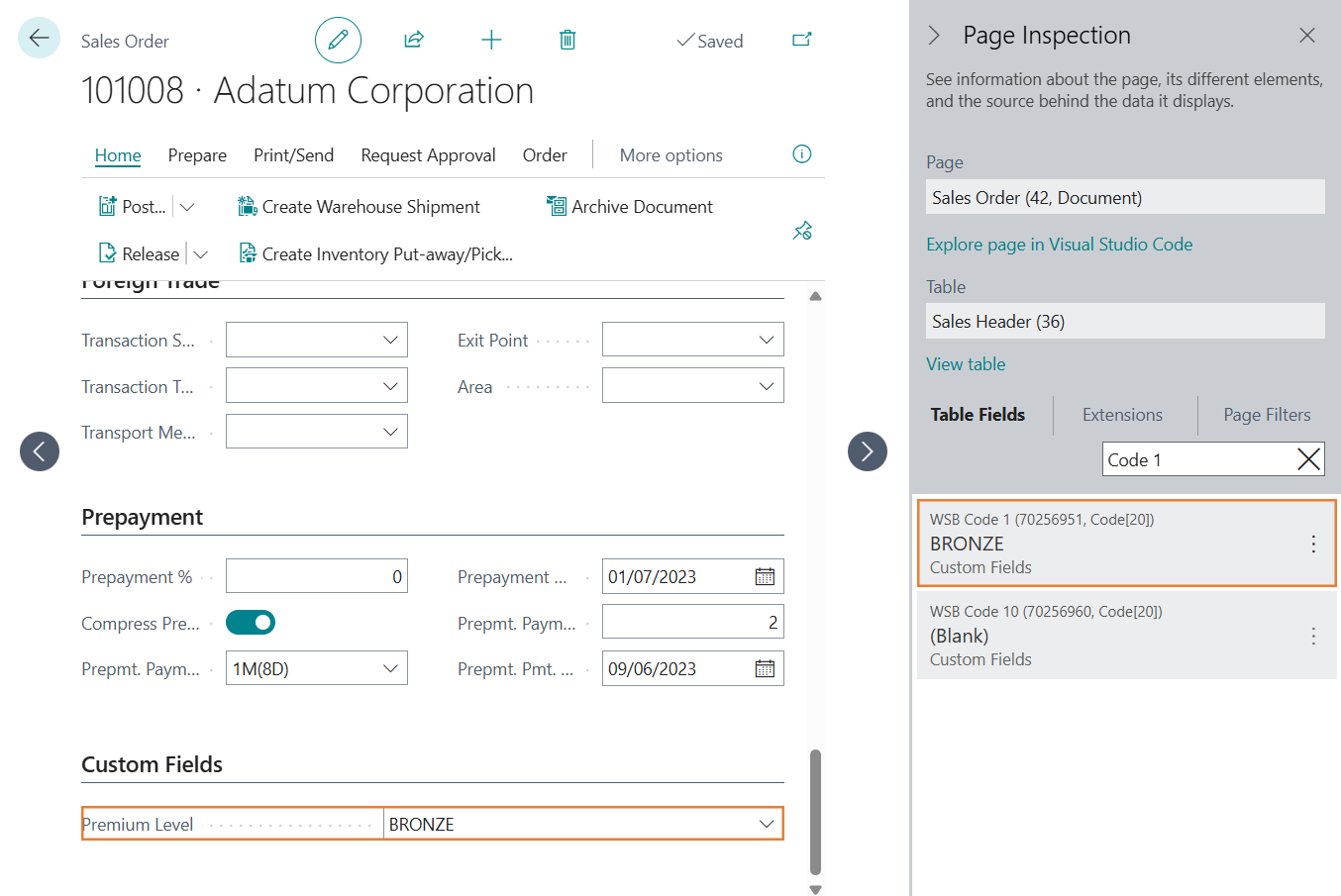 Then, the name of the table field will be WSB Code 1, which we can confirm by opening the Page Inspector (Ctrl+Alt+F1) on the Sales Order page: