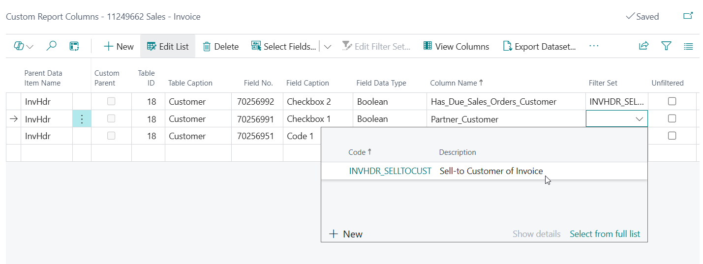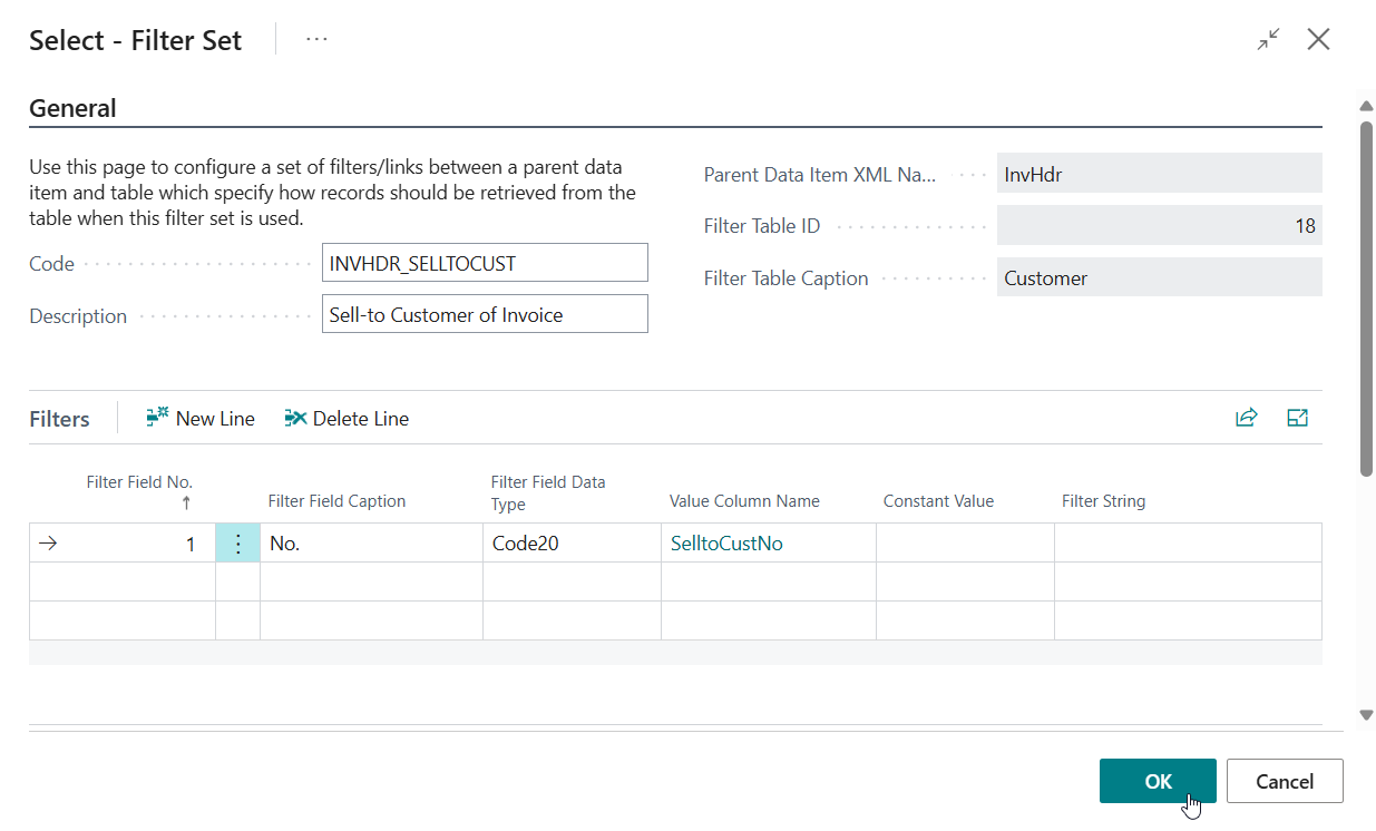 The final thing we need to do is create/select a Filter Set for each of the records to specify that we want to take the field values from the Sell-to Customer of the posted sales invoice (and not from the bill-to customer or another customer).