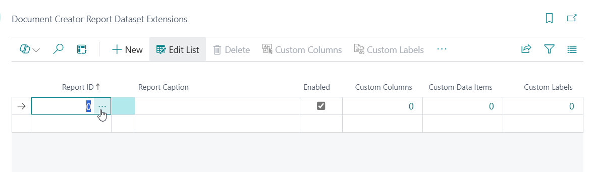 Use the Tell Me search feature (Alt+Q, or click on the ‑icon in the top right corner) to search for and open up the Document Creator Report Dataset Extensions page.