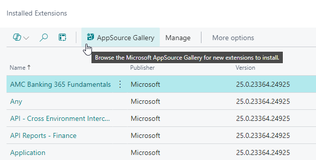 On the page, invoke the AppSource Gallery action to search for available AppSource extensions: