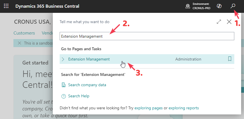 In Microsoft Dynamics 365 Business Central, go to Setup & Extensions | Extensions (or, use the Tell Me search feature to search for and open the Extension Management page).